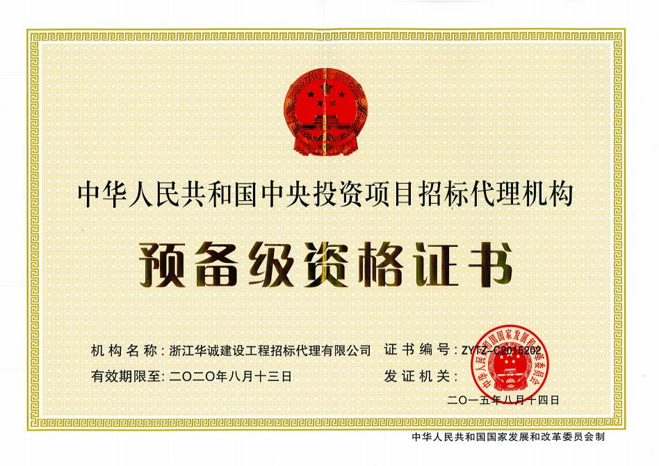 中央投資項(xiàng)目招標(biāo)代理機(jī)構(gòu)資格證書